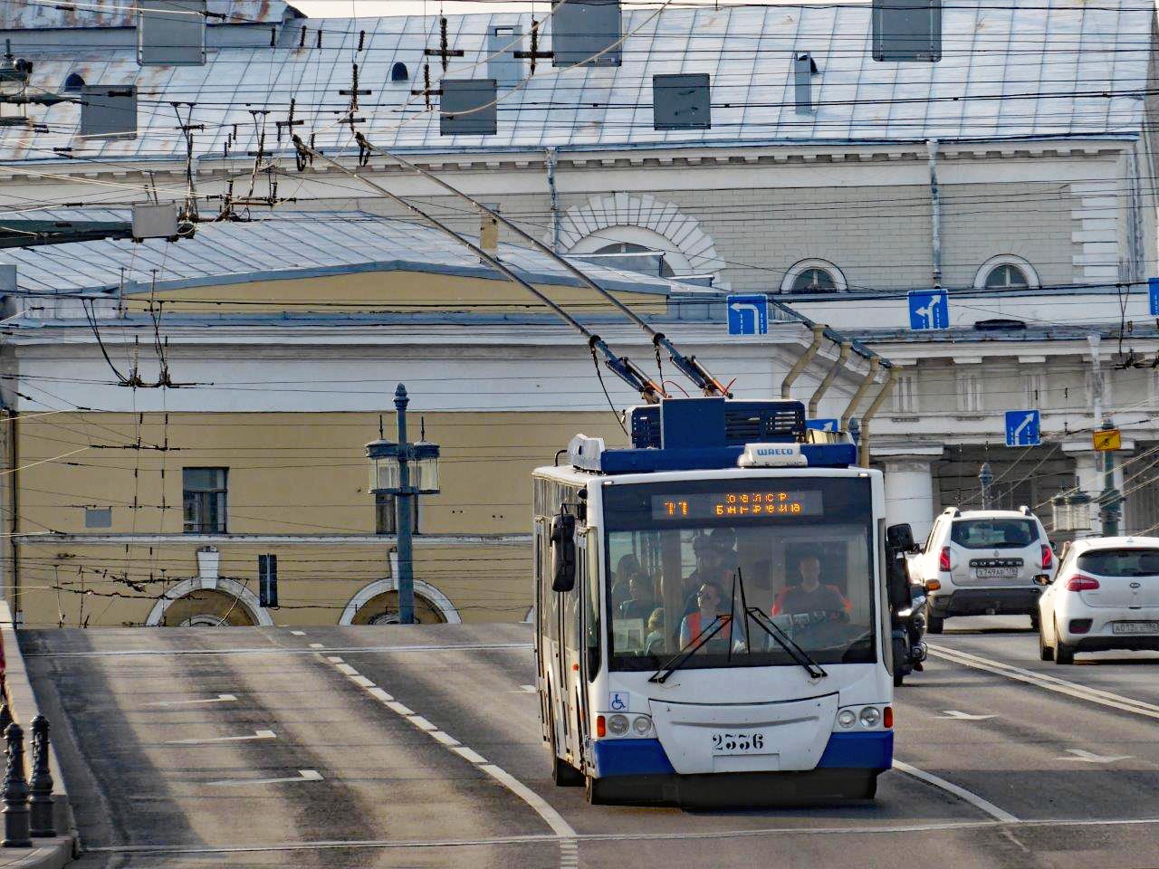 St. Petersburg, Oberleitungsbus 3510 (Trolza / 2013) auf Linie 10 auch auf der Dvortsovyy-Brücke, mit spezieller Überkopfverengung zum Anheben der Brückenkonstruktion.