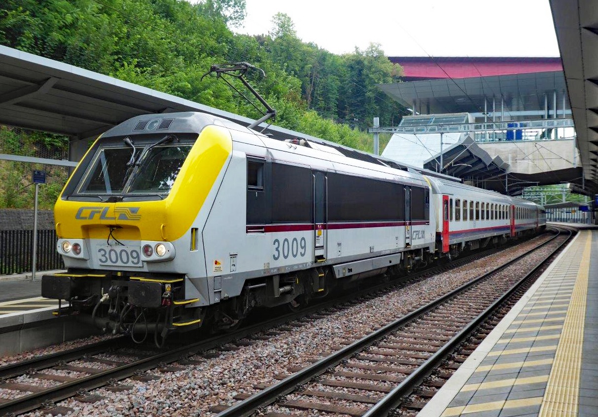 Luxemburg: CFL 3009 (Alstom/1998) mit IC beim Halt in Pfaffenthal-Kirchberg – oberhalb der Gleise, die Talstation der Standseilbahn
