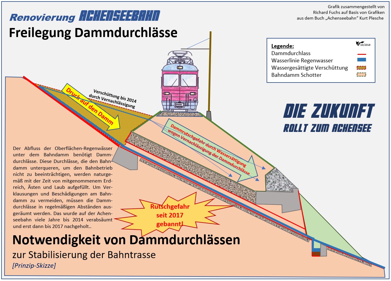 Diese enormen Kräfte und die Umwelteinflüsse wie Regen, Schnee, Schmelzwasser und Eis (Frosttaufbrüche) wirken permanent auf den Unterbau ein. Genau aus diesem Grund muss, neben dem Oberbau, der Unterbau (siehe Grafik) ständig gepflegt werden, was bei der Achenseebahn über viele Jahre nicht gemacht wurde. Um Regen und Schmelzwasser zu kanalisieren, wurden bereits beim Bahnbau Dammdurchlässe gebaut. Es bringt die Funktion der Dammdurchlässe, dass mit dem Oberflächenwasser in die Durchlassröhren auch Schotter, Äste und Laub eingebracht werden. Wird das, wie bei der Achenseebahn geschehen, über Jahre nicht gemacht, wachsen die Dammdurchlässe zu, das Oberflächenwasser findet den Kanal nicht mehr und sickert durch das Erdreich des Bahndammes. Ein wasserdurchsättigter Bahndamm wird irgendwann instabil und bringt, im allerschlimmsten Fall, den Damm mit einem vollbesetzten Zug zum Absturz.