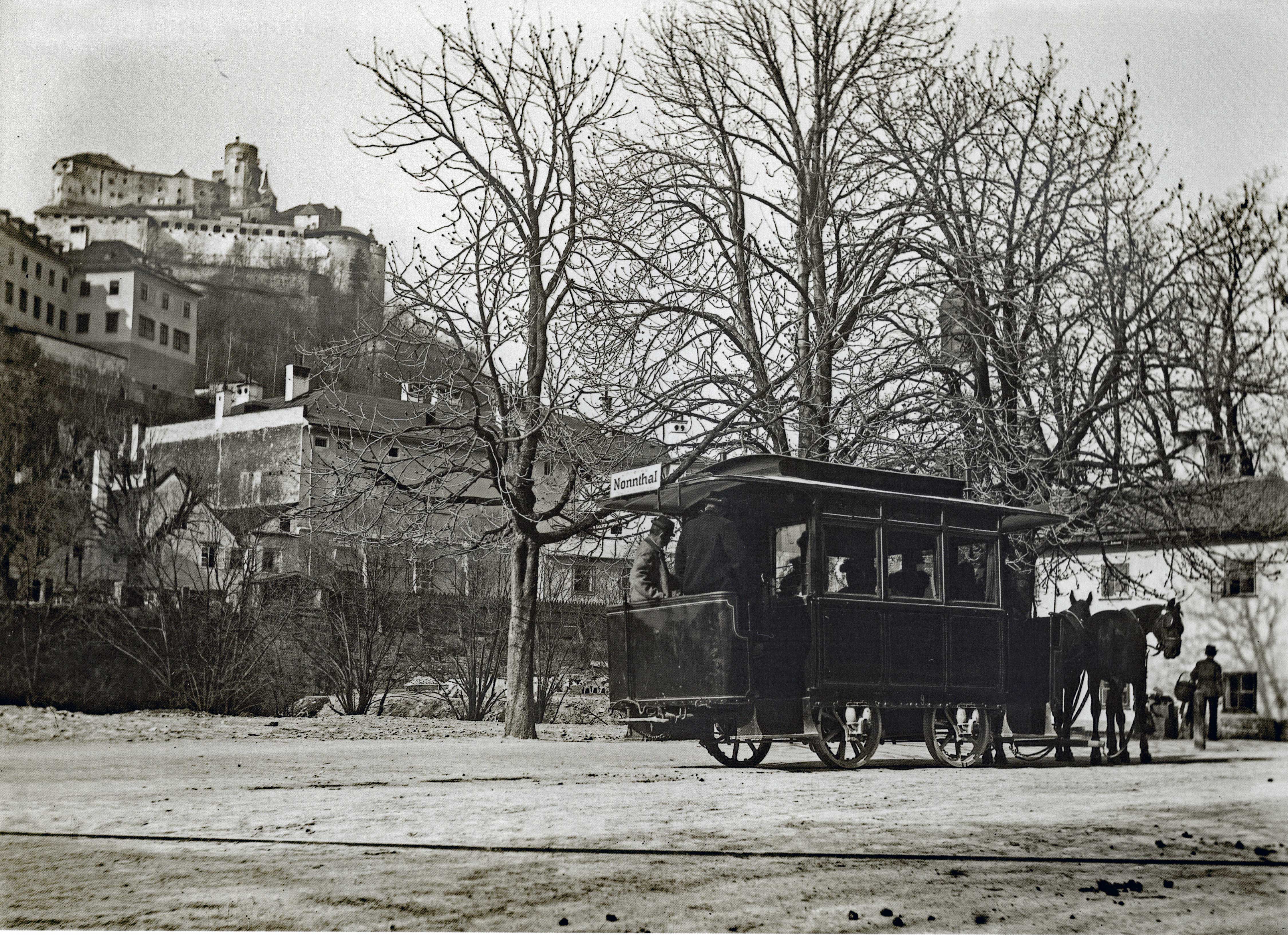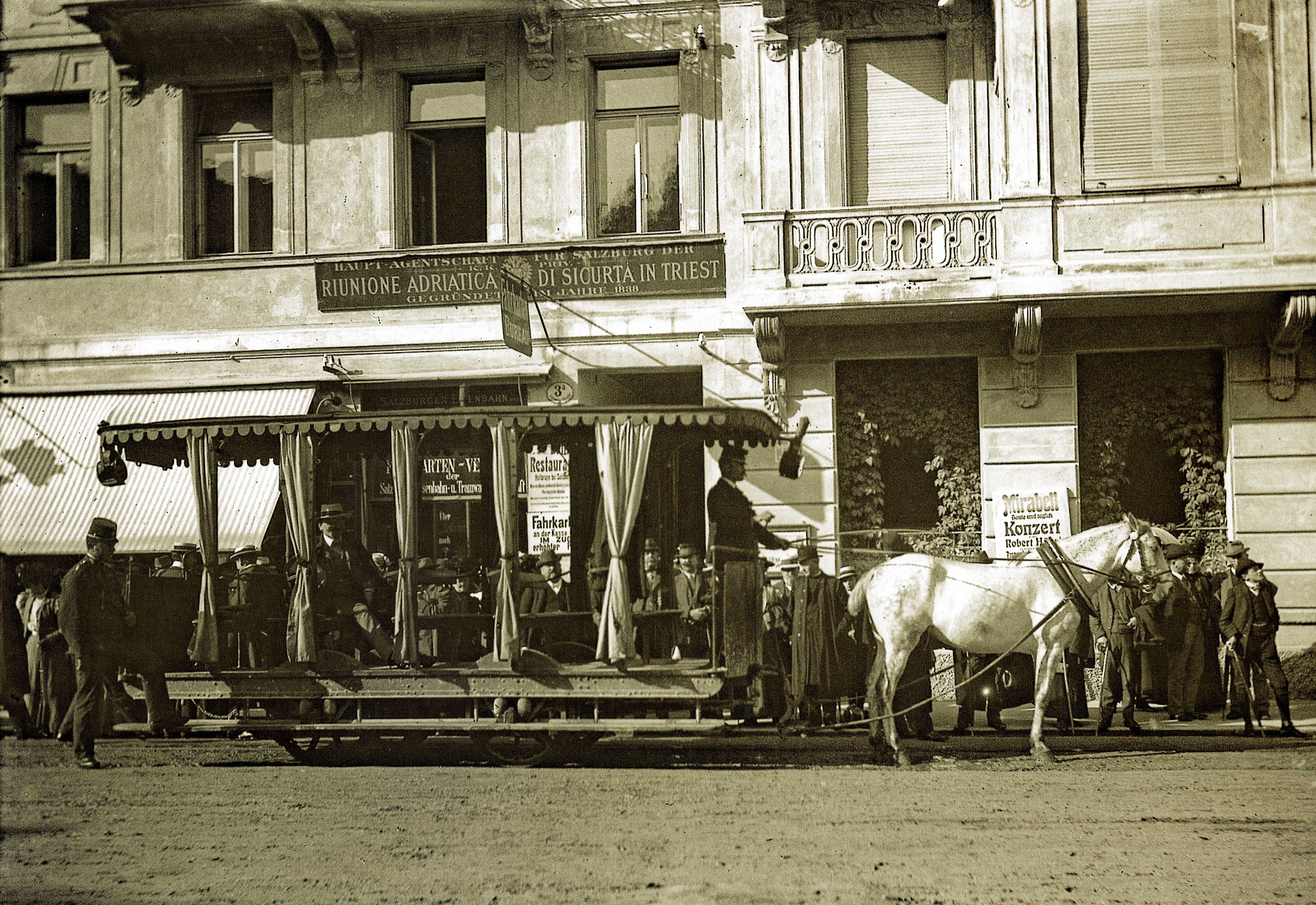 Würthle & Co. 1907. Bereits 1887 gab es Pferdebahnbetrieb Bahnhof bis Bazar. Ab 1892 betrieb die SETG eine Pferdebahn vom Bahnhof über die Schwarzstraße auf den Residenzplatz und nach Nonntal. 1908 wurde der Pferdebahnbetrieb eingestellt.