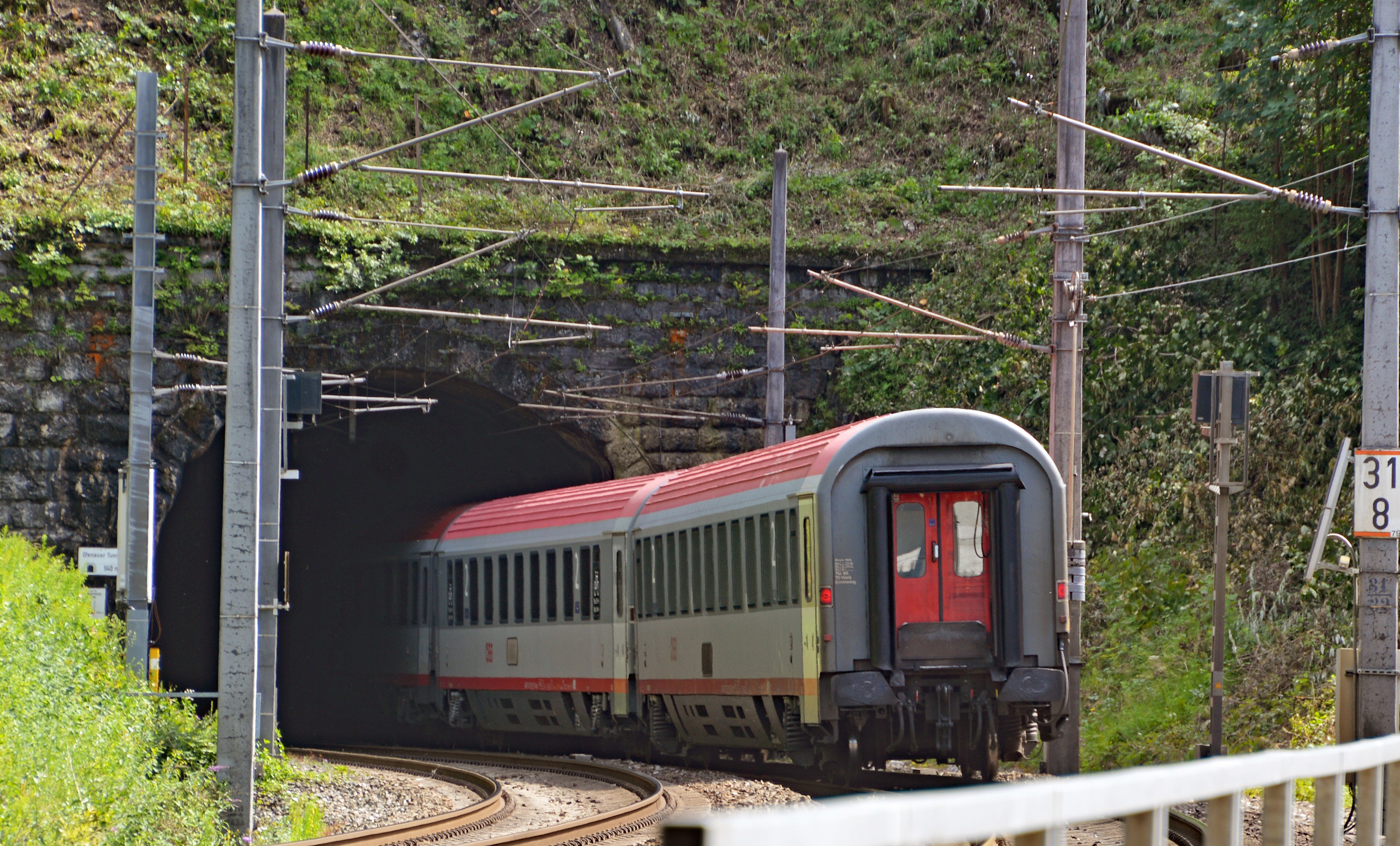 Einfahrt des Intercity nach Graz in den Ofenauer-Eisenbahn-Tunnel am Paß Lueg neben dem Leube-Werk in Golling.