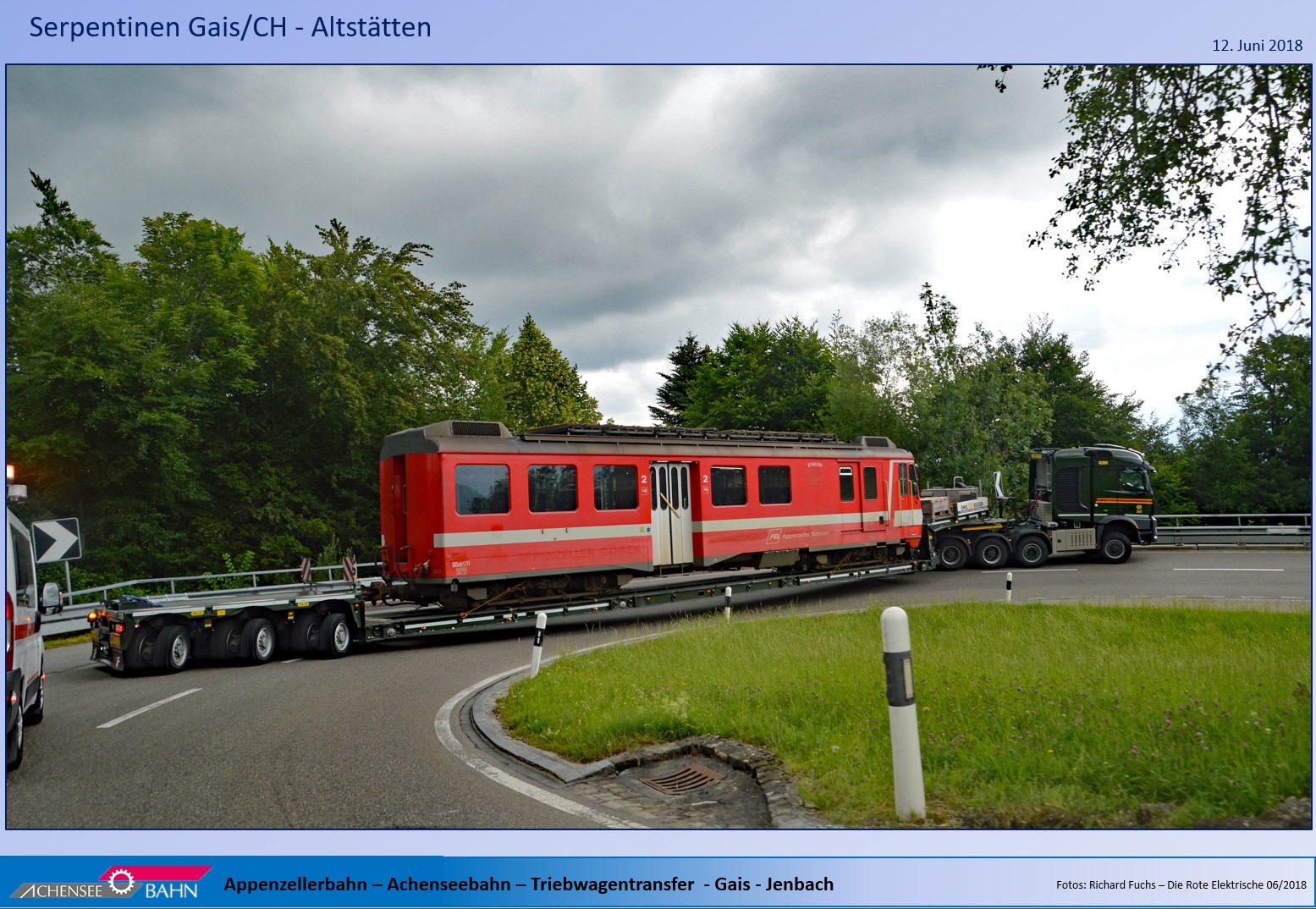 Die Ankunft der Appenzellerbahn-Triebwagen war im Sommer 2018 ein epochales Ereignis, ohne das vermutlich die Achenseebahn nicht mehr existieren dürfte. Für die Tiroler Politiker, die die Achenseebahn eigentlich loswerden wollten, war dies ganz offensichtlich eine Art "Betriebsunfall"! Die Fahrer der Fa. Emil Egger, die in Jenbach den Tieflader mit den Triebwagen vom Kreisverkehr bis zur Achenseebahn-Remise geschoben haben, muss man als eine Art "Künstler" beschreiben!