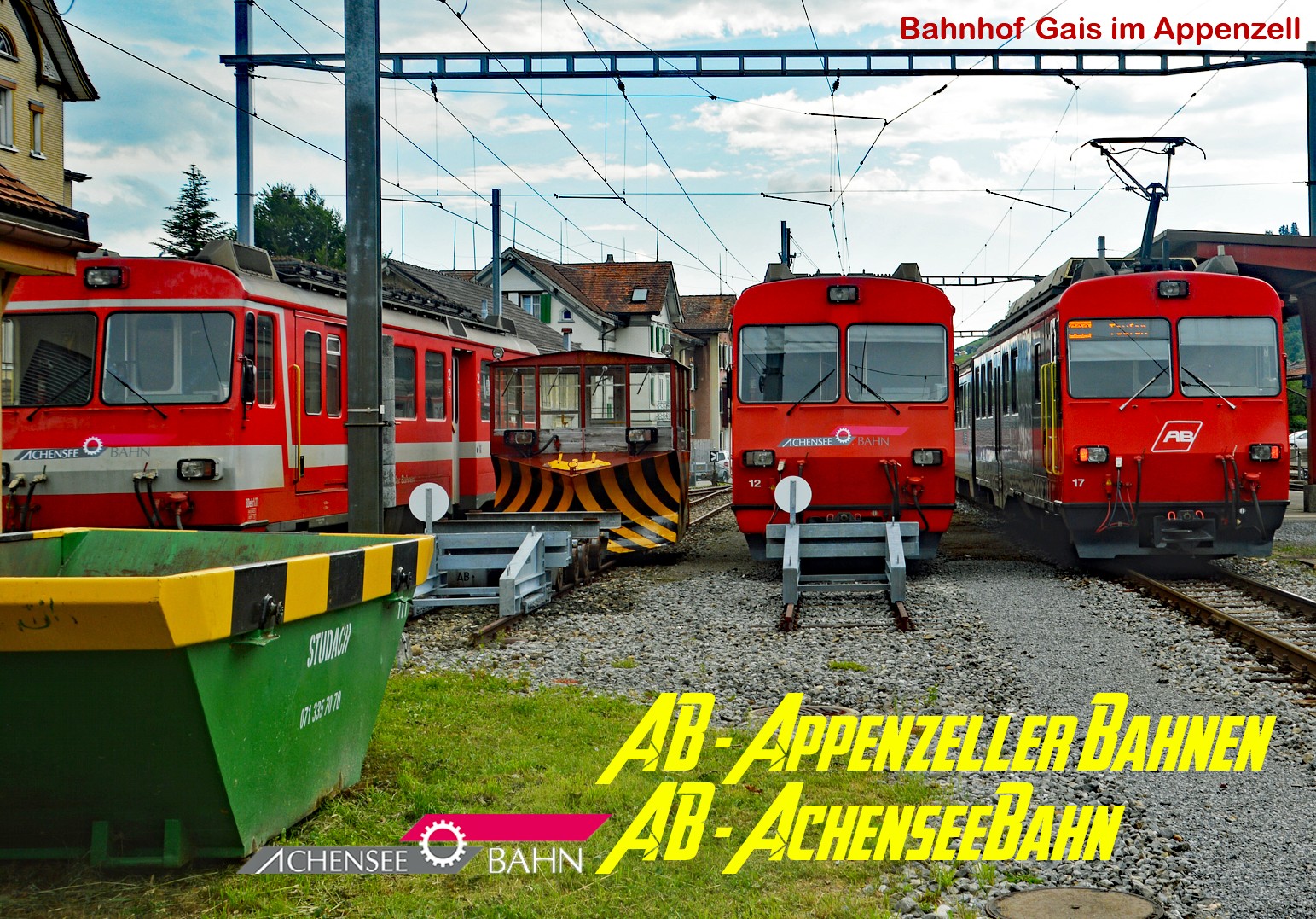 Anfang Juni 2018 werden die rund 30 Jahre alten BDeh-4-4-Triebwagen im Bahnhof Gais im Appenzell für den Abtransport zur Achenseebahn nach Jenbach bereitgestellt. Die Fahrzeuge wechselten sozusagen von der AB in der Schweiz zur AB in Tirol!