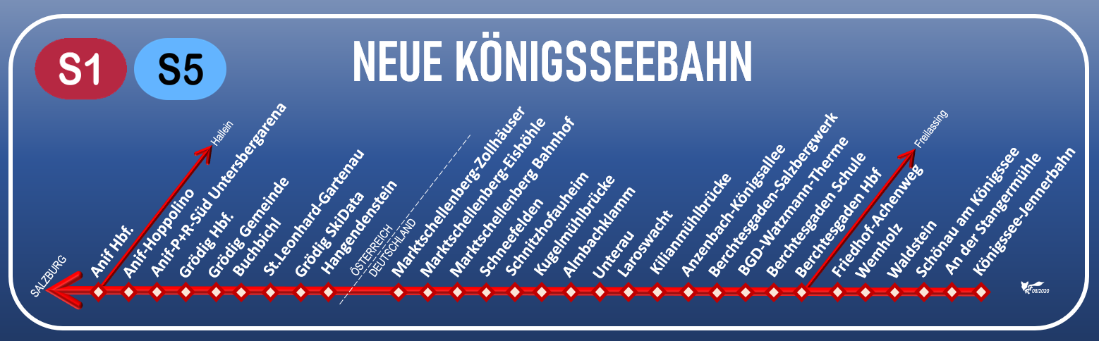 Perlenschnur der Haltestellen für die 22 Kilometer lange Neue Königsseebahn (16 km in Deutschland) zwischen Anif und Königssee.