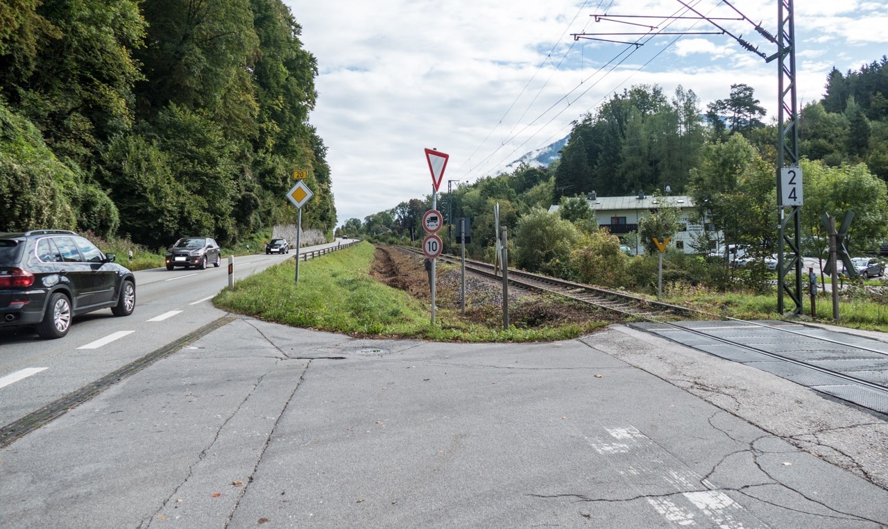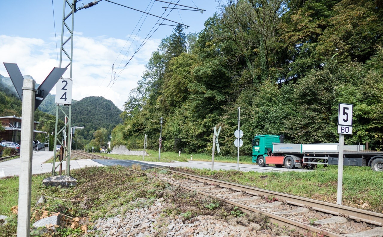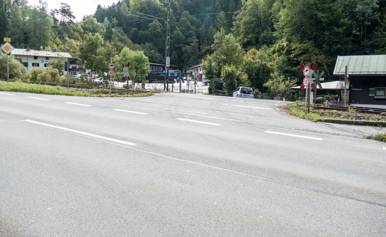 Bahnübergang - Fahrtrichtung Bad Reichenhall. Da hier einmal pro Tag ein PKW verkehren könnte, muss natürlich der Zug auf 5km/h abbremsen und das in der Steigung.