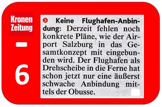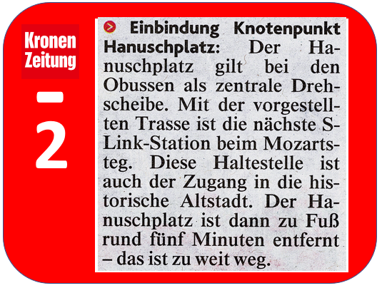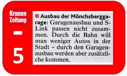Der sinnlose Ausbau der Mönchsberggarage kann kein „Nachteil des S-Link“ sein! Im Gegenteil, weil eigentlich gehört dieser Punkt in der Kronenzeitung unter die Rubrik „Vorteile“. Gerade der S-Link macht die Mönchsberggarage überflüssig, weil er die einzig mögliche leistungsfähige Alternative zum Straßenverkehr in der Stadt Salzburg ist. In der Stadt Salzburg gibt es mittlerweile genug Parkgaragen, die fast nie ausgelastet sind. Das beweisen die vielen Parkgaragen-Ampeln, die die jeweilige Auslastung der Garagen aufzeigen.