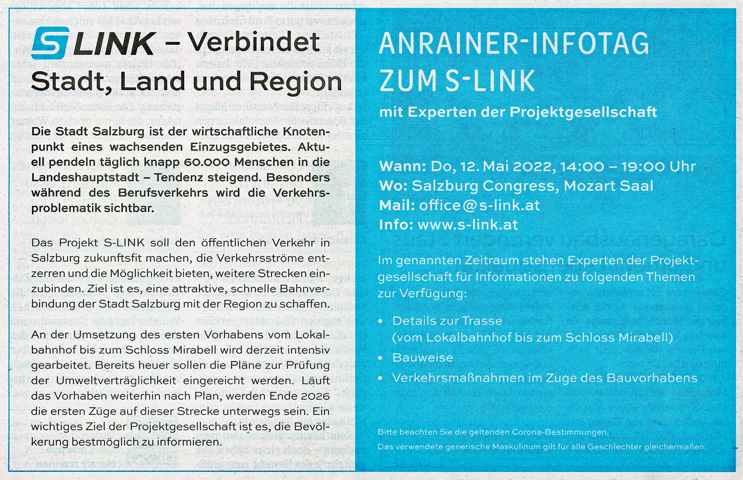 Die Projektgesellschaft Regionalstadtbahn Salzburg "S-Link" führte am 12. Mai 2022 einen sogenannten "Anrainer-Infotag zum S-Link" durch, in dem im Salzburg Kongresshaus (Mozart-Saal) das erste Baulos "Hauptbahnhof bis Mirabellplatz" präsentiert wurde. Weiters wurden alle Anrainer direkt angesprochen und konnten ihre Fragen und Bedenken artikulieren. Nachdem die Gegner des Projektes mit der Falschinformation "600-Meter-U-Bahn Hauptbahnhof bis Mirabell" eine mediale Hetzkampagne gestartet haben, sind natürlich die Anrainer verunsichert. Um diese Verunsicherungen auszuräumen, wurde dieser "Anrainer-Info-Tag" durchgeführt.
