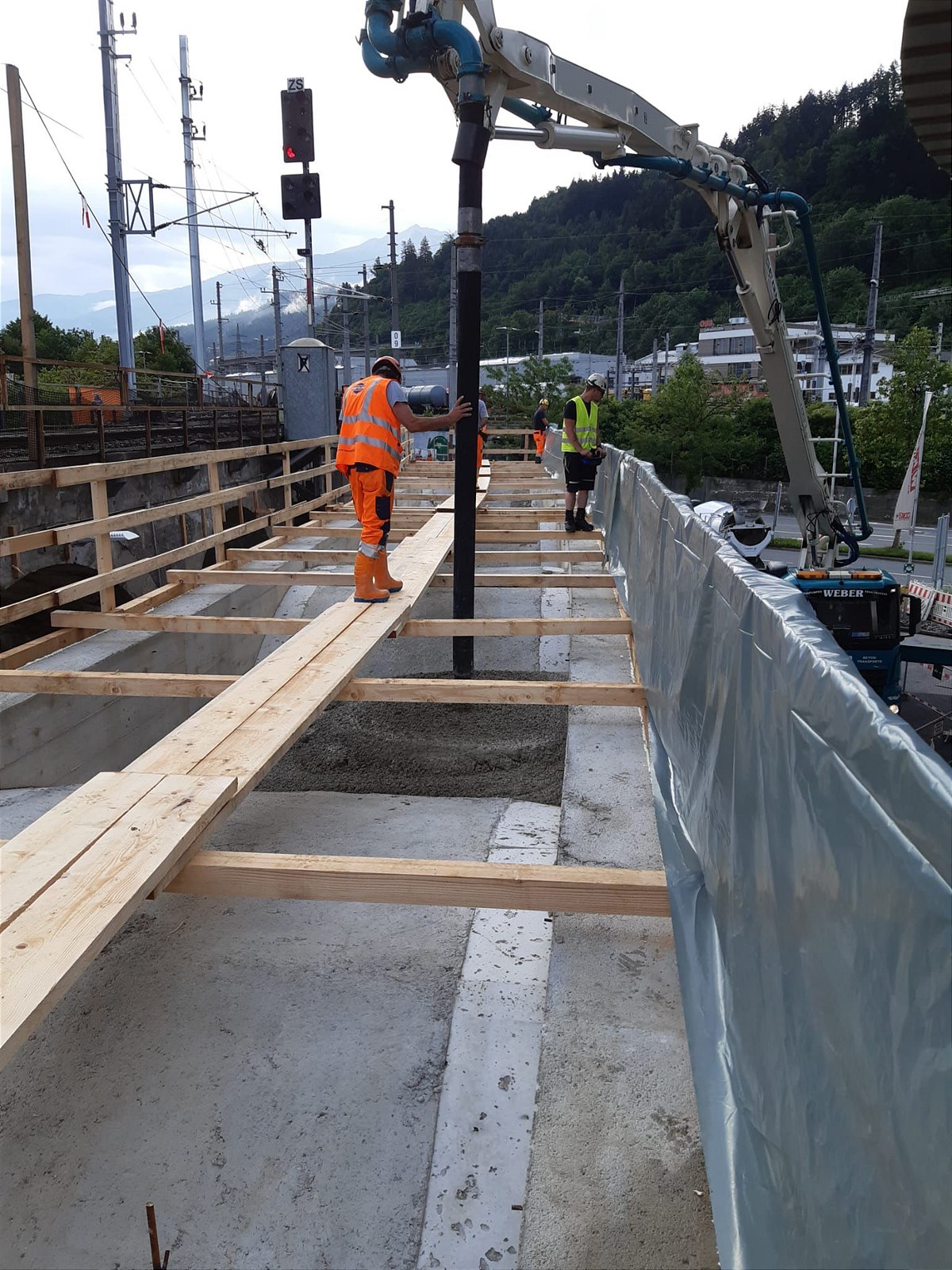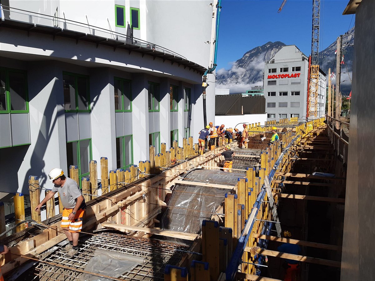 Während der Hauptbauphase von 15. Juli bis 22. August 2022 finden zahlreiche Einzelmaßnahmen entlang der Strecke statt. So werden insgesamt über 5.500 Meter Schienen und 3.000 Stück Schwellen getauscht. Dabei werden rund 2.500 Tonnen Gleisschotter verarbeitet. Die außergewöhnlichste Baustelle der Arbeiten an der Karwendelstrecke ist sicher das denkmalgeschützte, historische Inntalviadukt im Westen von Innsbruck. Das Viadukt, bestehend aus 35 Bögen im Bereich zwischen der Egger-Lienz-Straße und dem Innrain wurde im Jahr 1910 errichtet. Die Gewölbe weisen jeweils eine Lichtweite von 6 m auf und bestehen aus Stampfbeton ohne Bewehrung. 16 Bögen des Bauwerks sind trotz mehrerer aufwändigen örtlichen Sanierungen in der Vergangenheit am Ende der Lebensdauer. Um den hohen Sicherheitsstandard bei den ÖBB auch in diesem Abschnitt künftig sicherzustellen, müssen diese 16 Gewölbebögen erneuert werden. Die Vorarbeiten dazu haben bereits im April 2022 begonnen. Während der Hauptarbeiten werden die ersten 8 Stück Bogentragwerke auf einem Lehrgerüst, inkl. Verschubbahn, seitlich zum bestehenden Tragwerk hergestellt. Sämtliche Arbeiten am denkmalgeschützten Viadukt erfolgen unter Einhaltung der Vorgaben des Bundesdenkmalamtes. Auf einer Fläche von rund 180 m² wird die Tragwerksplatte als Fertigteil hergestellt. Ebenfalls als Fertigteil hergestellt werden ca. 140 lfm. Randbalken. Der Einschub des neuen, rund 2.000 Tonnen schweren, Tragwerks für das Inntalviadukt ist für Ende Juli, bzw. Anfang August vorgesehen. Dabei wird das Tragwerk in einem spektakulären Vorgang mit hydraulischen Pressen als Ganzes eingeschoben.