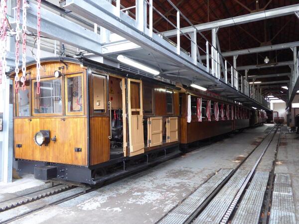 Lok 5 (SLM/1912) vormals Luchon – Superbagneres unterhalb der Bergstation. Ansicht einer aufwendigen Fahrleitungsweiche für die doppelpolige Drehstromfahrleitung. Lok 1 (SLM/1914) im Depot.