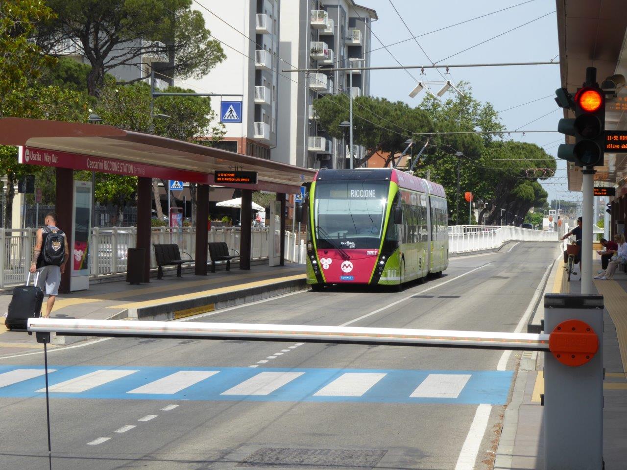 Trolleybus 36517 arrived in Riccione FS – barriers protect the trolleybus only lane from cars.