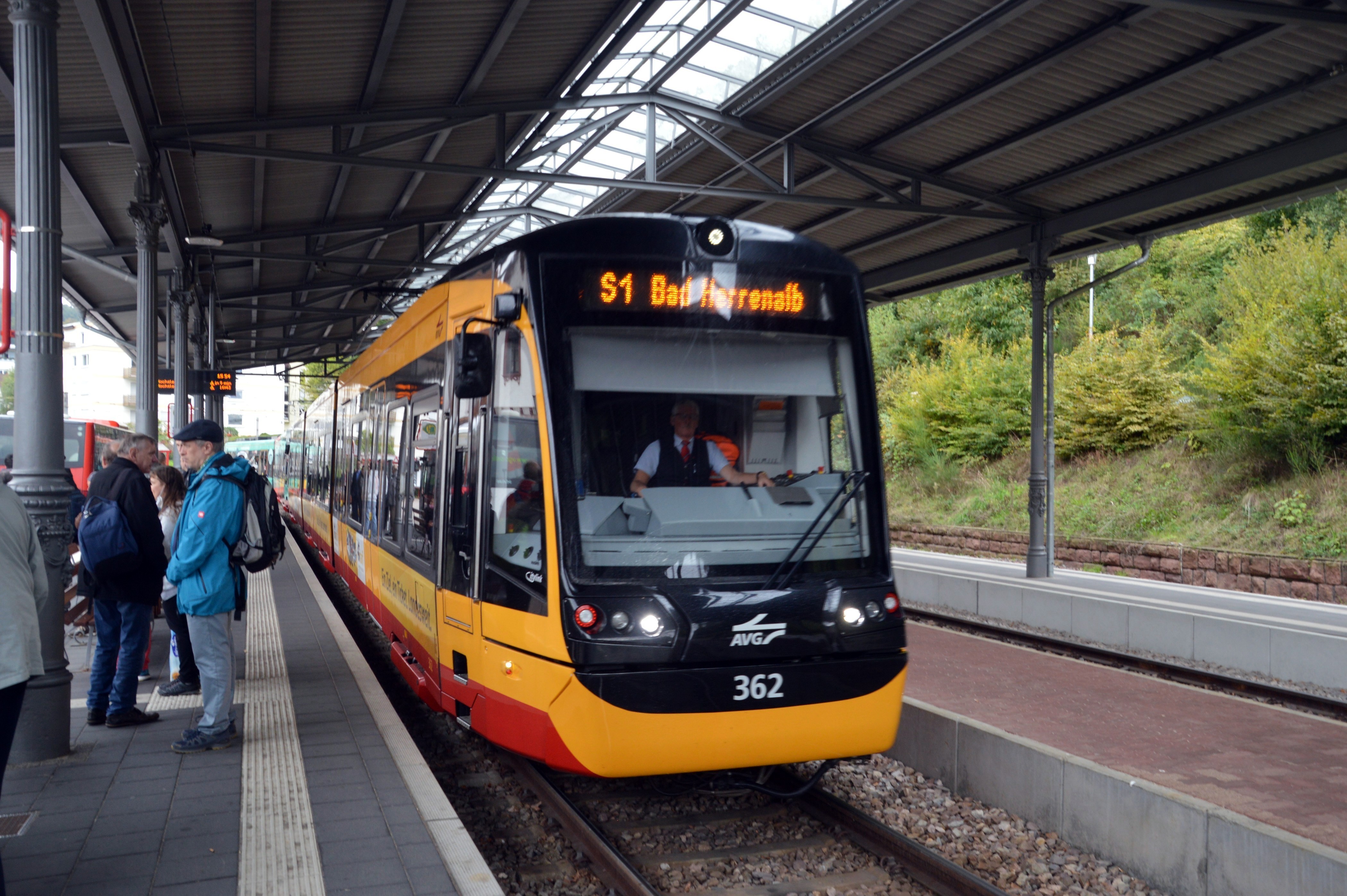 Das "Karlsruher Modell" - Die Verknüpfung zwischen Stadtbahn und Eisenbahn, seit etwa 2000 auch als Tram-Train bezeichnet. Bad Herrenalb, AVG, Linien S1/S11. Ein Teil der Bahnhofshalle des früheren Bahnhofes Baden-Baden steht in Bad Herrenalb und der zweite Teil im Bahnhof Ettlingen-Stadt