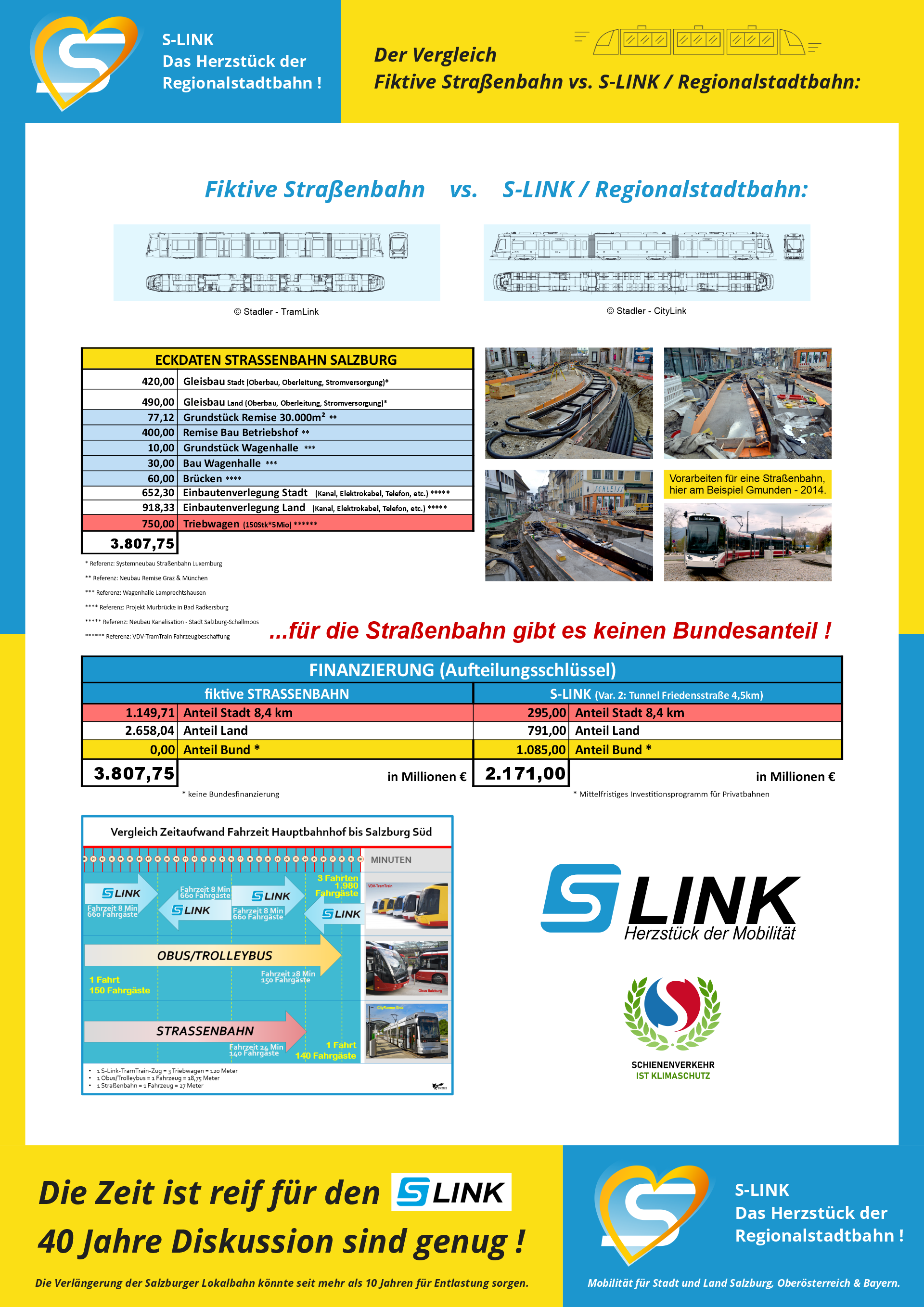 Für die Mitfinanzierung des Bundes gibt es klare „Spielregeln“. Nach dem Privatbahngesetz gibt es für Infrastrukturbauten für „Privatbahnen“, wie die Salzburger Lokalbahn eine ist, 50% Bundesanteil aus dem Mittelfristigen Investitionsprogramm des Bundes (MIP-Mittel alle 5 Jahre). Für Straßenbahnen gibt es definitiv keinen Cent! So müsste, über einen Zeitraum von 10 Jahren, die Stadt Salzburg für eine Straßenbahn 1.150 Millionen Euro bezahlen, für den S-Link Variante 2 mit Tunnel bis Friedensstraße 295 Mio. Euro oder jährlich 29,5 Mio aufbringen!