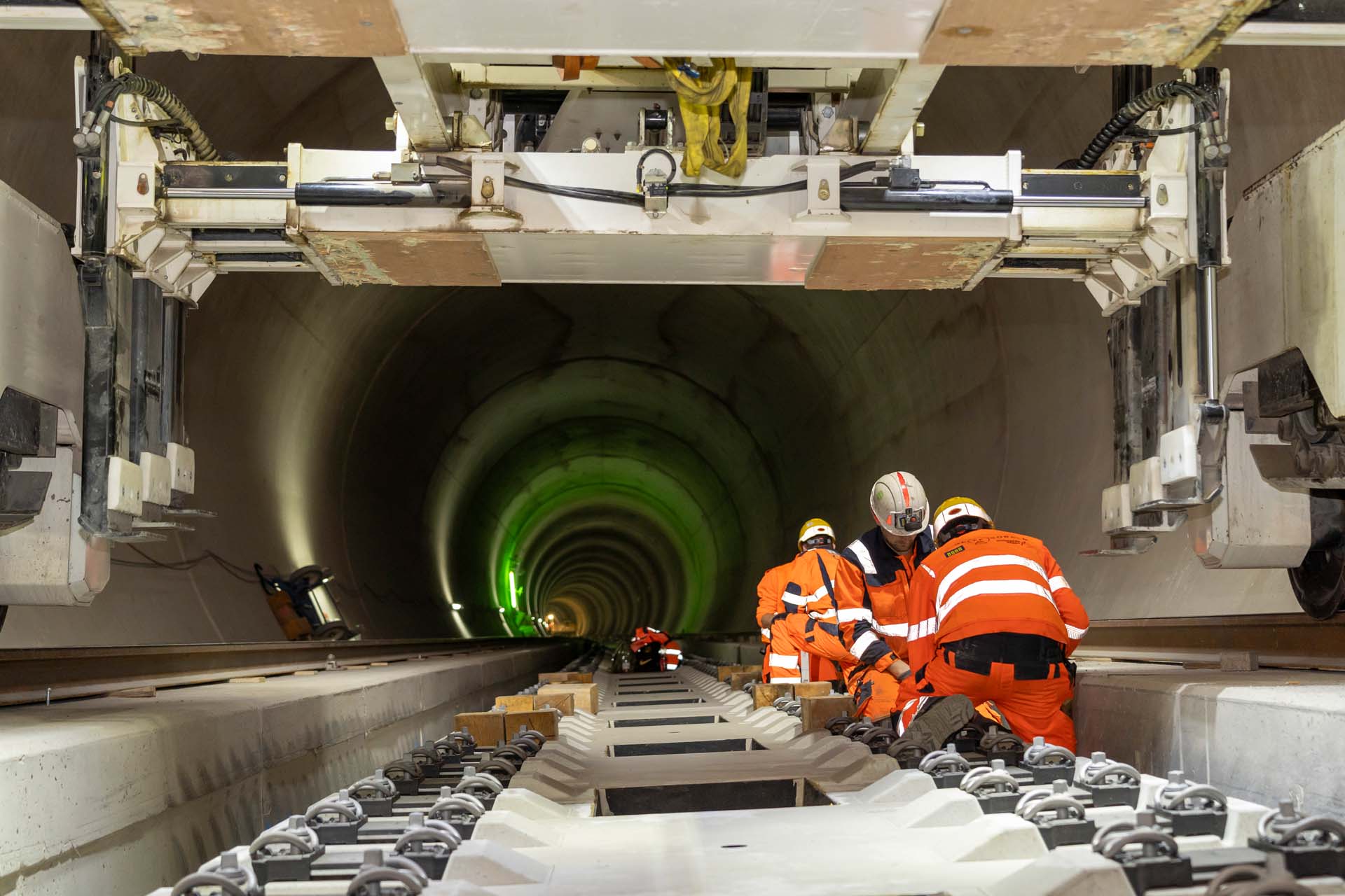 Bei dieser finalen Bauphase sind bis zu 400 Menschen im Einsatz. Bis zu zehn Transportzüge bringen die Mannschaften und das Material täglich in den Tunnel – rund um die Uhr, sieben Tage die Woche.