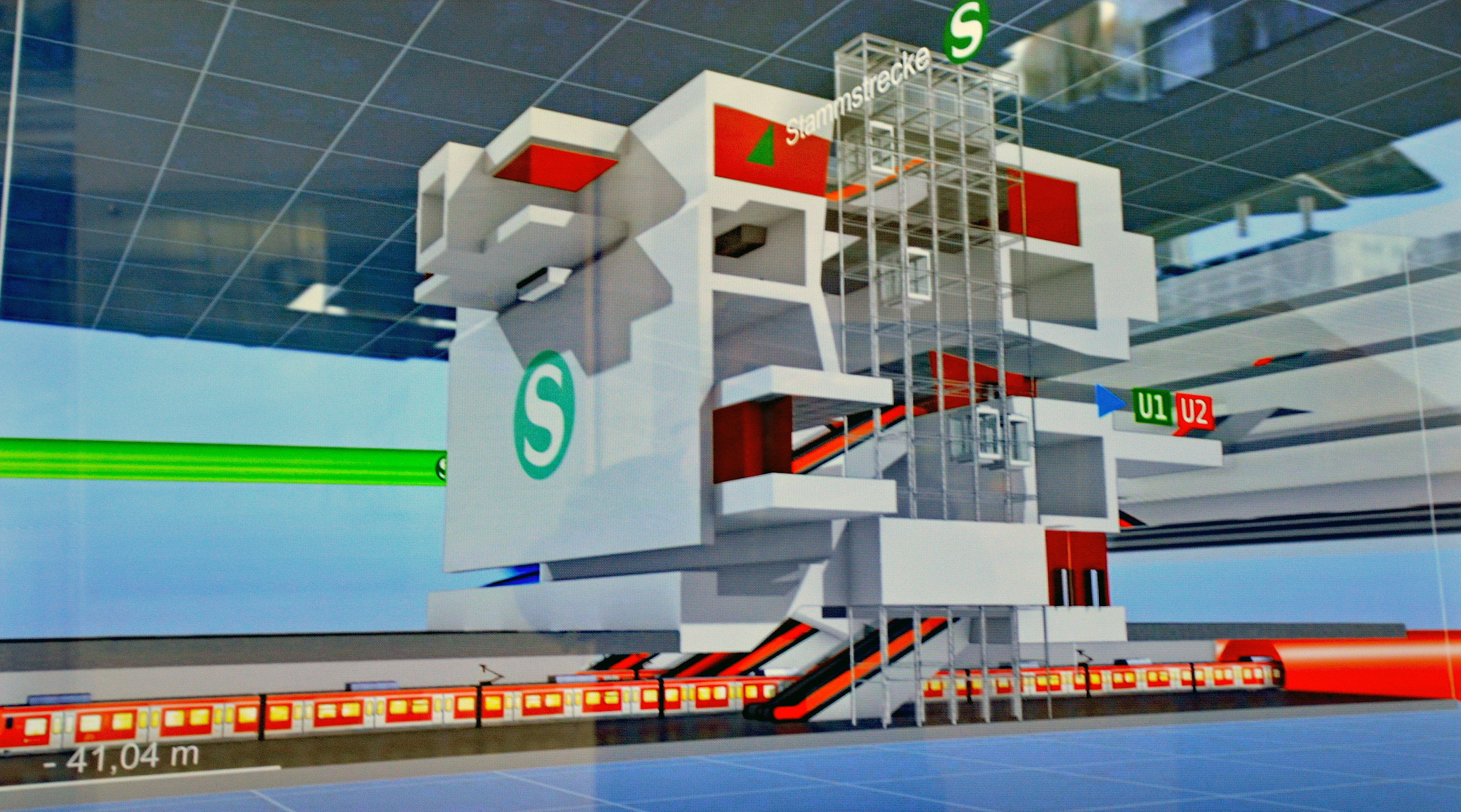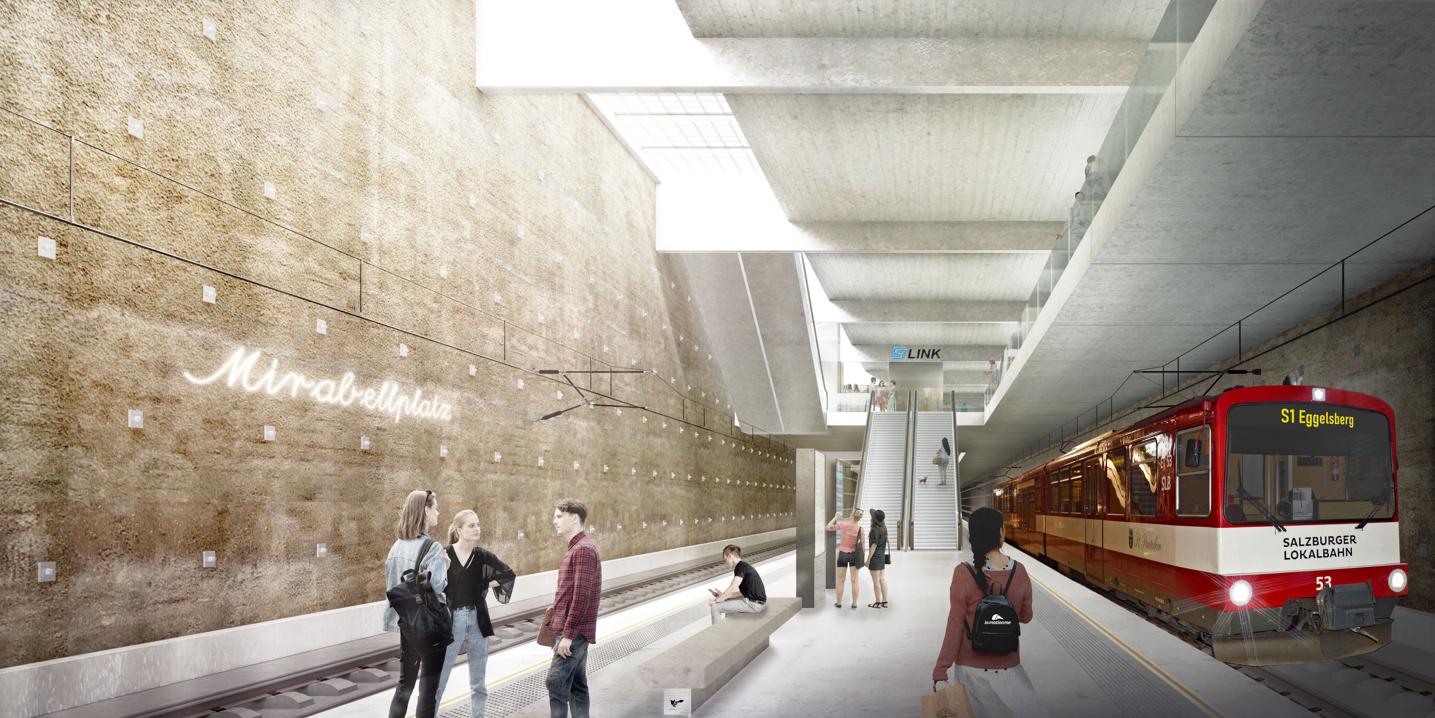 Zug der Salzburger Lokalbahn in der künftigen S-LINK Haltestelle "Mirabellplatz". Originalfoto: Architekturgruppe "dunkelschwarz" - Fotomontage: "in-motion.me"