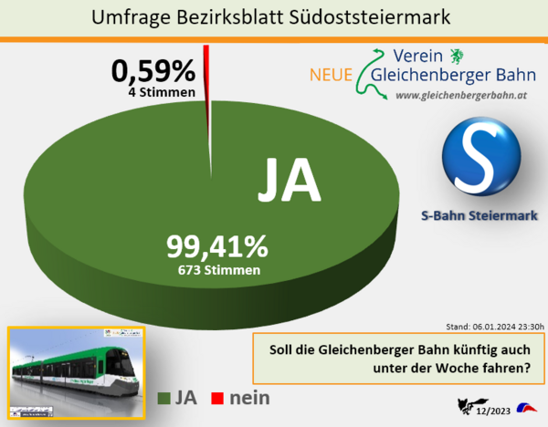 Bei einer Leserbefragung der Zeitung MeinBezirk Südoststeiermark über einen Ganztagesbetrieb auf der Gleichenberger Bahn mit Betrieb über die ganze Woche und das natürlich ganzjährig, stimmten 673 Unterstützer, das sind über 99% für Ja!