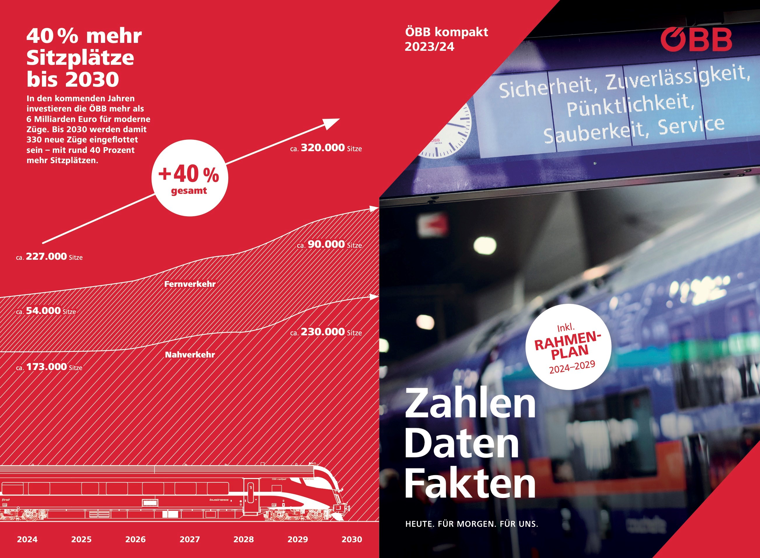 Dieses Jahr war es, erklärtes Ziel, den Zahlen-Daten-Fakten-Folder gleichzeitig mit dem ÖBB Geschäftsbericht 2023/24 zu veröffentlichen. Und wie jedes Jahr hat sich das Redaktionsteam etwas überlegt, um das Angebot für die Leser:innen zu erweitern und zu verbessern. In den letzten Ausgaben wurde beispielsweise begonnen, die Vorjahreszahlen „stehen“ zu lassen. Das ermöglicht einen Vergleich und zeigt zugleich die Veränderung. Hinzugekommen ist auch eine Seite mit der Postbusflotte oder eine Auswahl von Güterzügen. In diesem Jahr ist eine dritte Doppelseite für die Abbildung der Garnituren hinzugekommen. So ist es zudem möglich, den Railjet der neuen Generation und den Nightjet der neuen Generation mit seinen wesentlichen Daten zu zeigen, aber ebenso (fast) die gesamte Flotte. Die Arbeiten an der Ausgabe für das nächste Jahr sind bereits im vollen Gange.