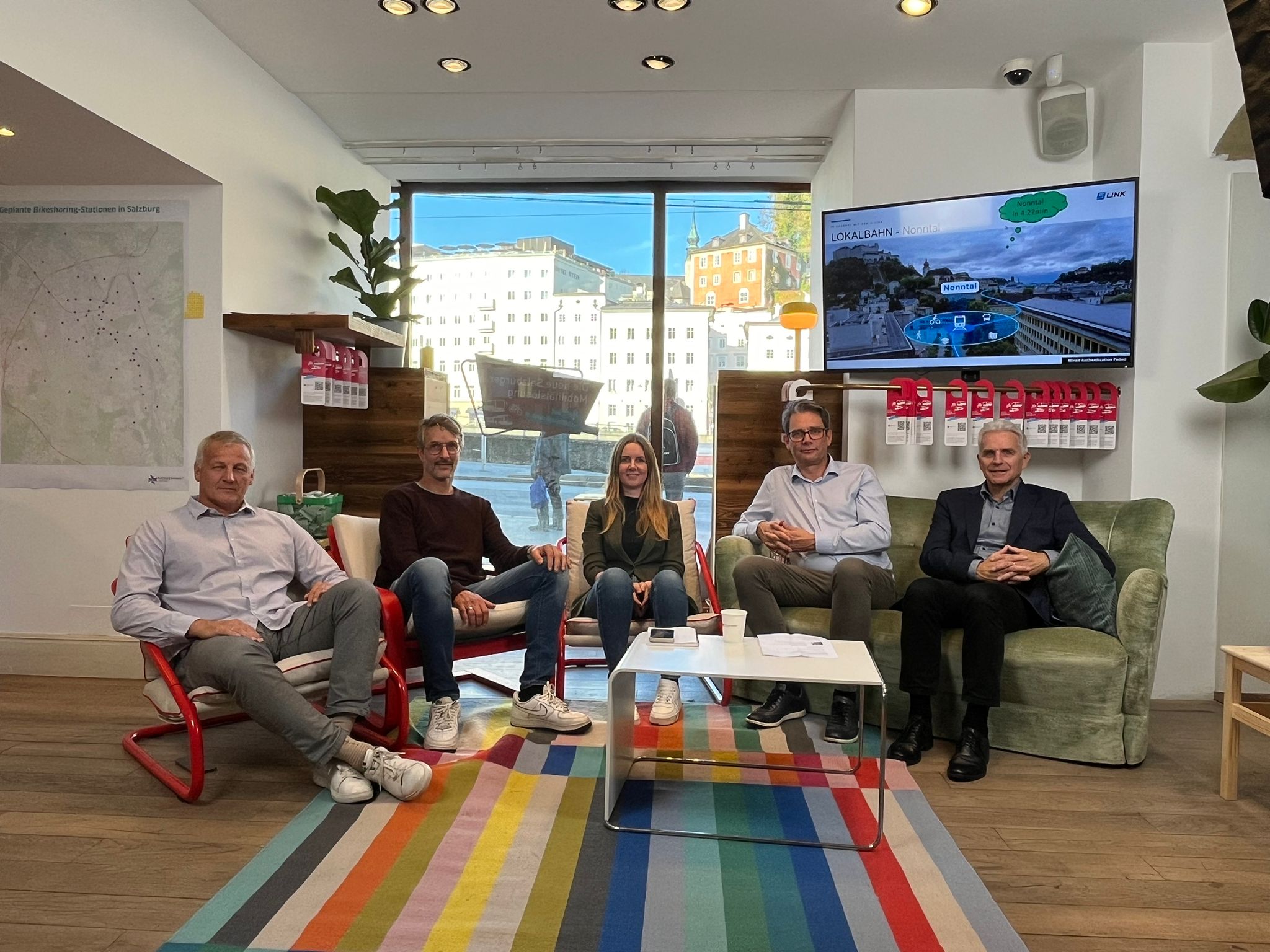 Zum Thema „Mobilitätslösung für Sportler:innen und Studierende“ diskutierten Montagnachmittag im POP-UP Infobüro v.l.n.r.: Herbert Wagner, Thomas Stöggl, Sabrina Rohrmoser, Johannes Gfrerer und Hermann Schwameder © Salzburger Verkehrsverbund