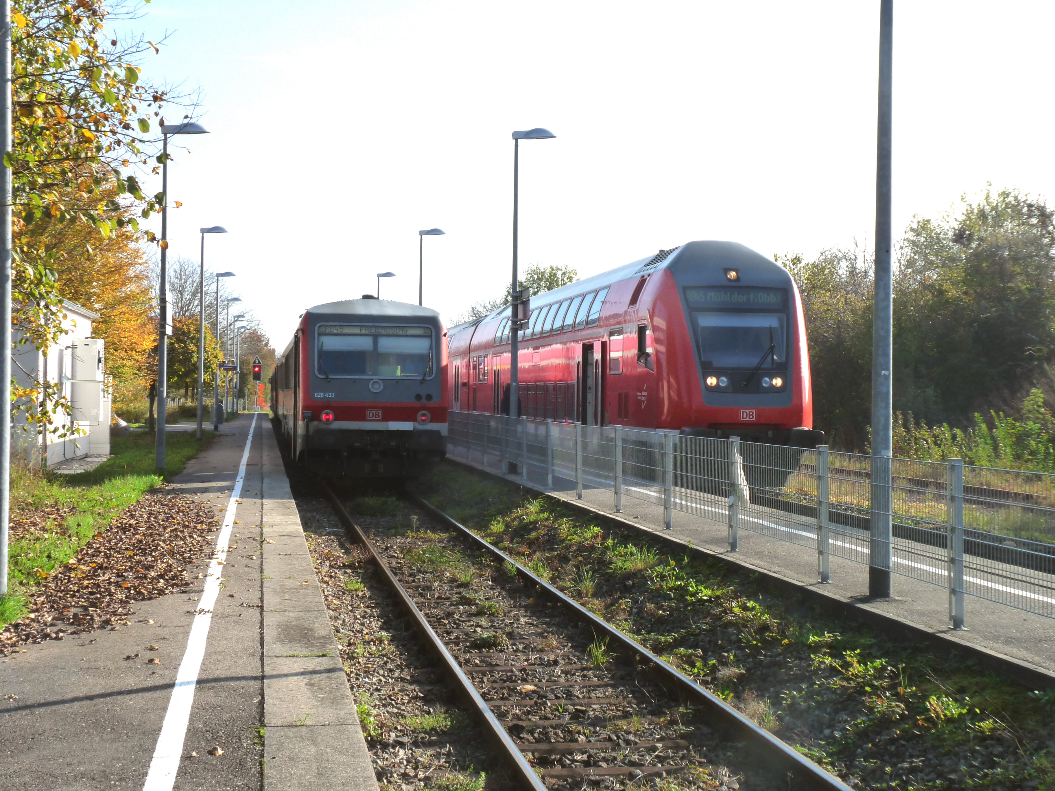 Elegant wirken die Steuerwagen der Dosto-Züge. Hier kreuzt ein solcher als RB 27980 am 26.10.2024 im Bahnhof Laufen mit der 628er-Doppelgarnitur der RB 27983.
