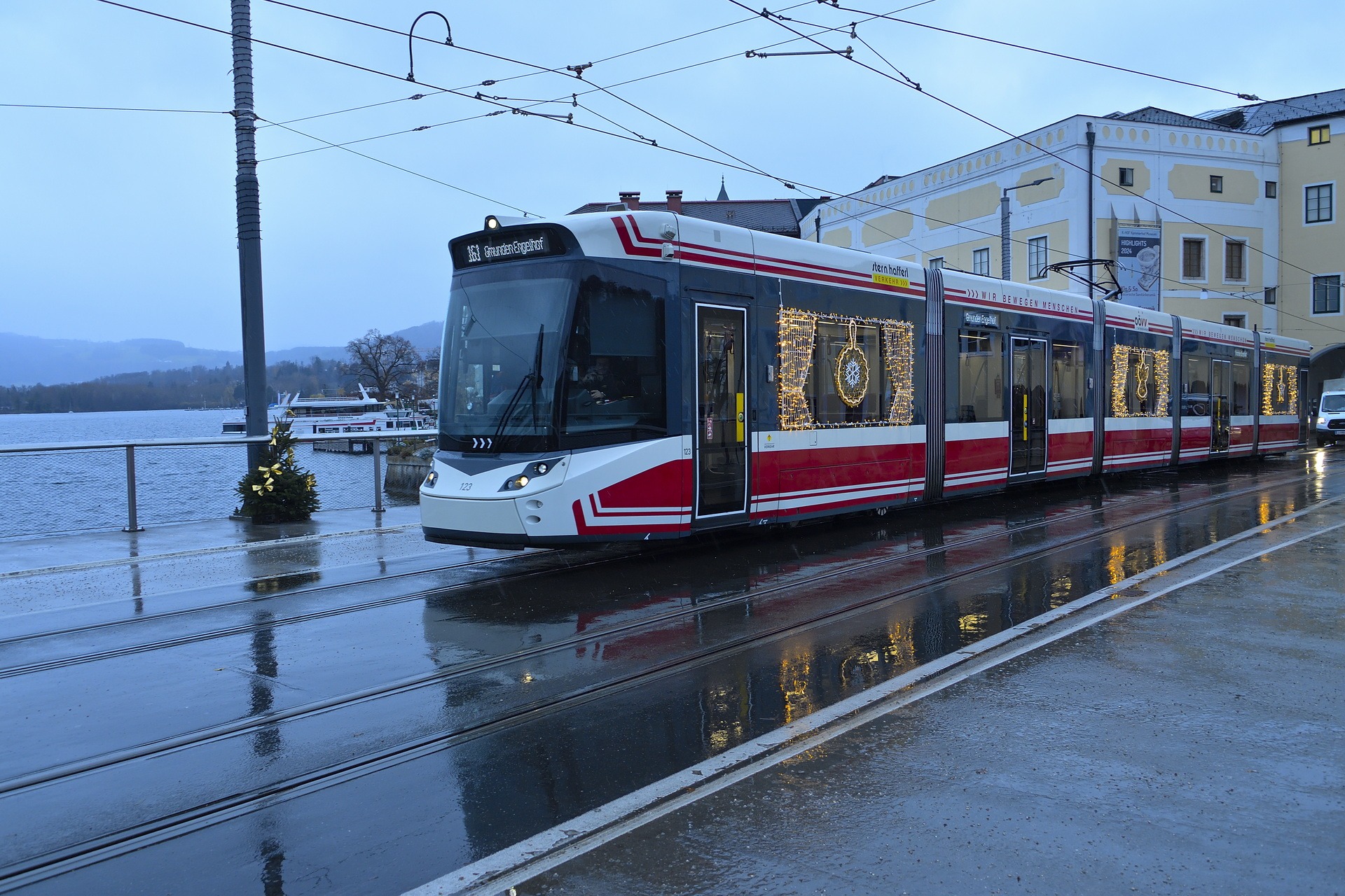 Erstmals schmückt eine festliche Weihnachtsbeleuchtung einen Tramlink der Traunseetram. Damit wird die vorweihnachtliche Stimmung in der Stadt unterstrichen, als auch ein weiteres Zeichen für den besonderen Charakter von Gmunden gesetzt. © Stern & Hafferl-Verkehr