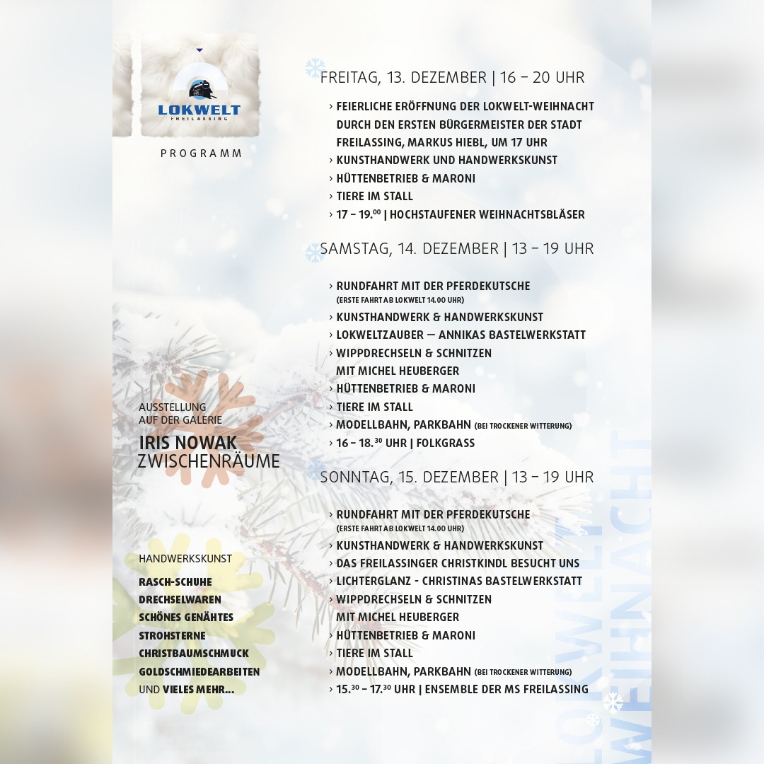 🎄✨ Erleben Sie magische Momente bei der Lokwelt-Weihnacht im Eisenbahnmuseum Freilassing! Kunsthandwerk, Konzerte, Parkbahnfahrten & Bastelspaß für Groß und Klein. Eröffnung: Freitag, 13. Dez., 17 Uhr. 🚂