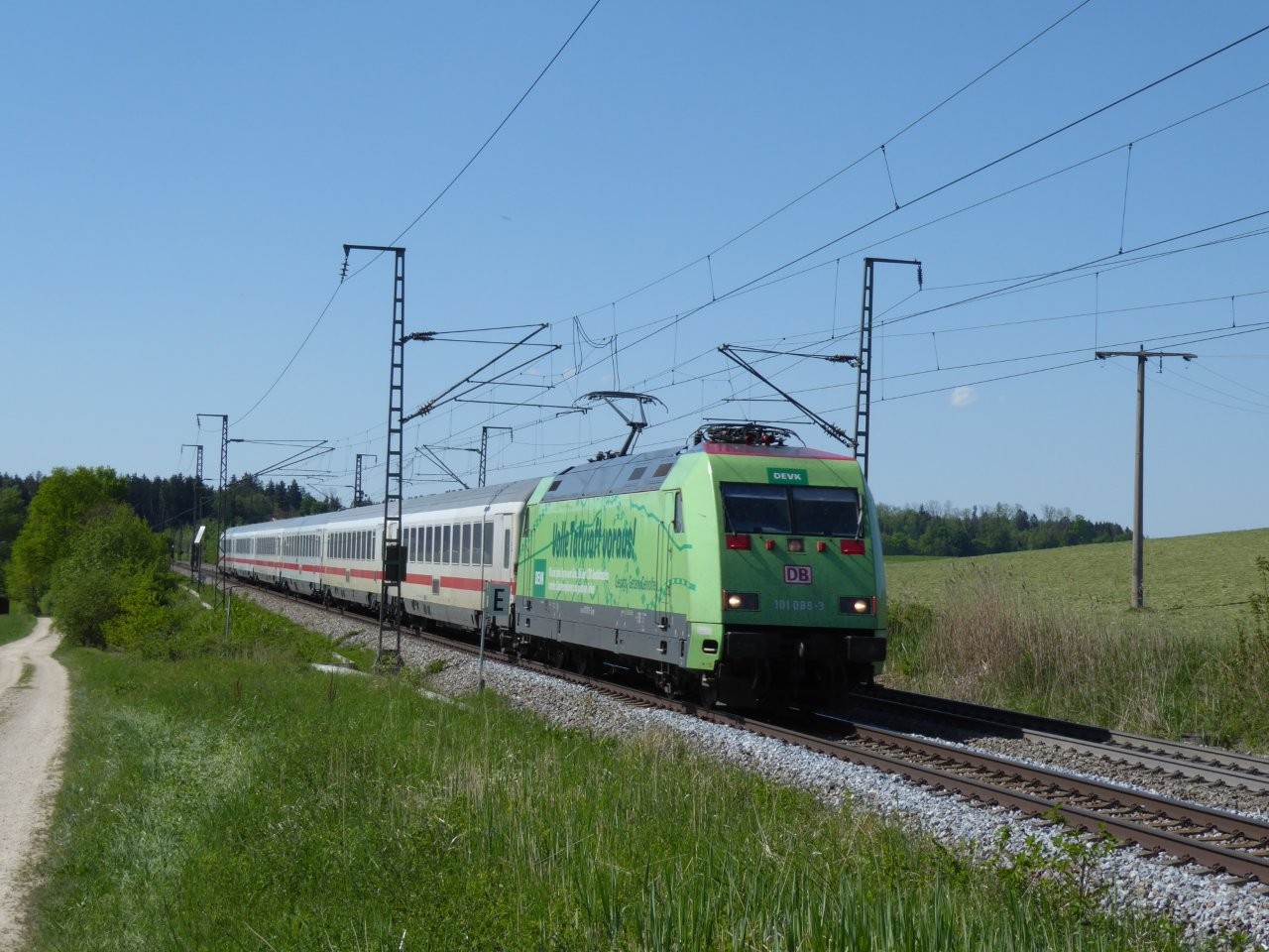Aus Richtung Hamburg wird der IC „Königssee“ bis Freilassing mit der Baureihe 101 traktioniert – hier die grüne DEVK Werbelok 101 088 bei Hörafing kurz vor Freilassing; 1. Mai 2025