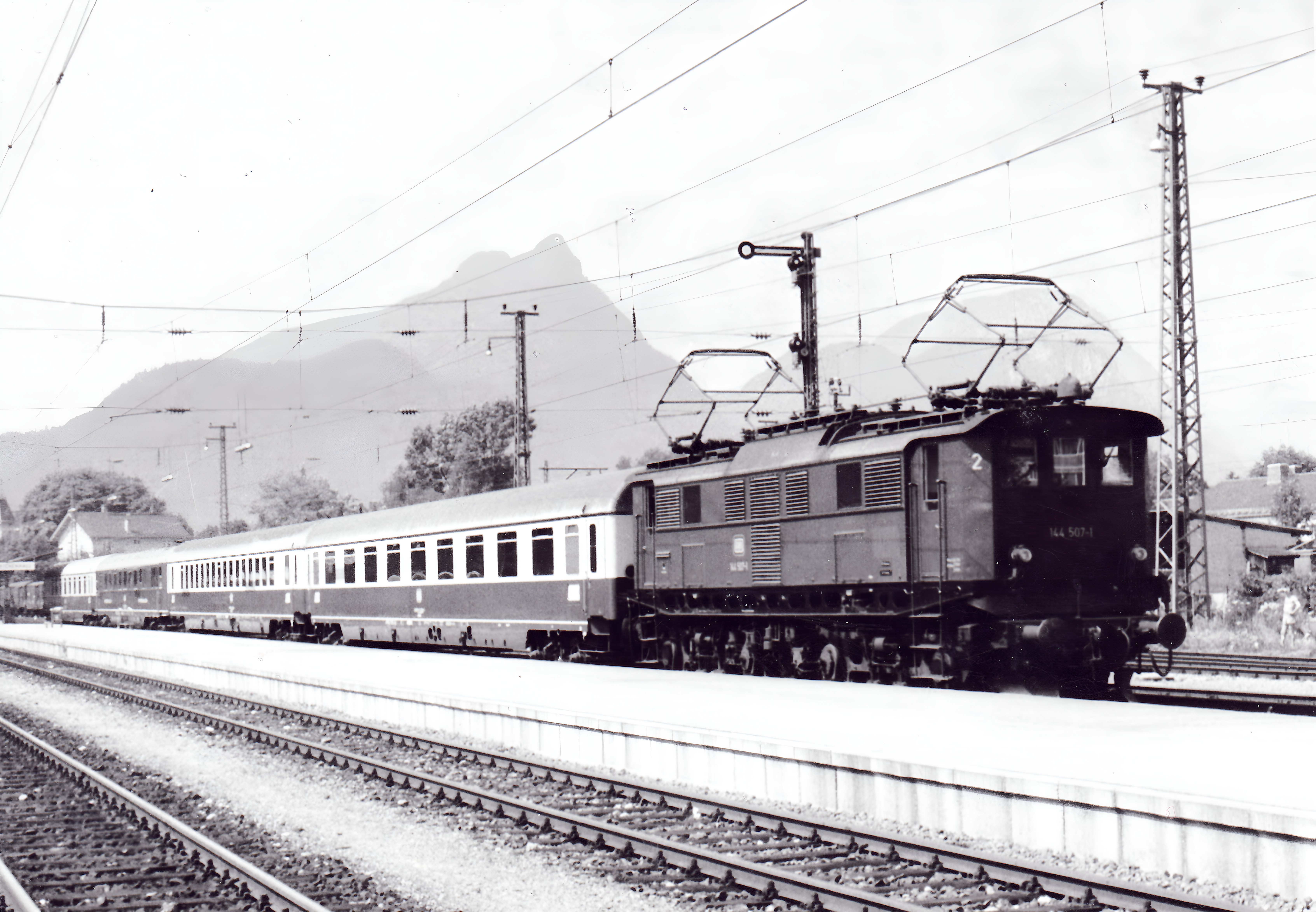 Reminiszenz – vor 50 Jahren der IC „Königssee“ (noch ausschließlich 1. Wagenklasse) mit 144 507 in Bad Reichenhall Hbf; Juni 1974. Nachbearbeitet durch in-motion.me